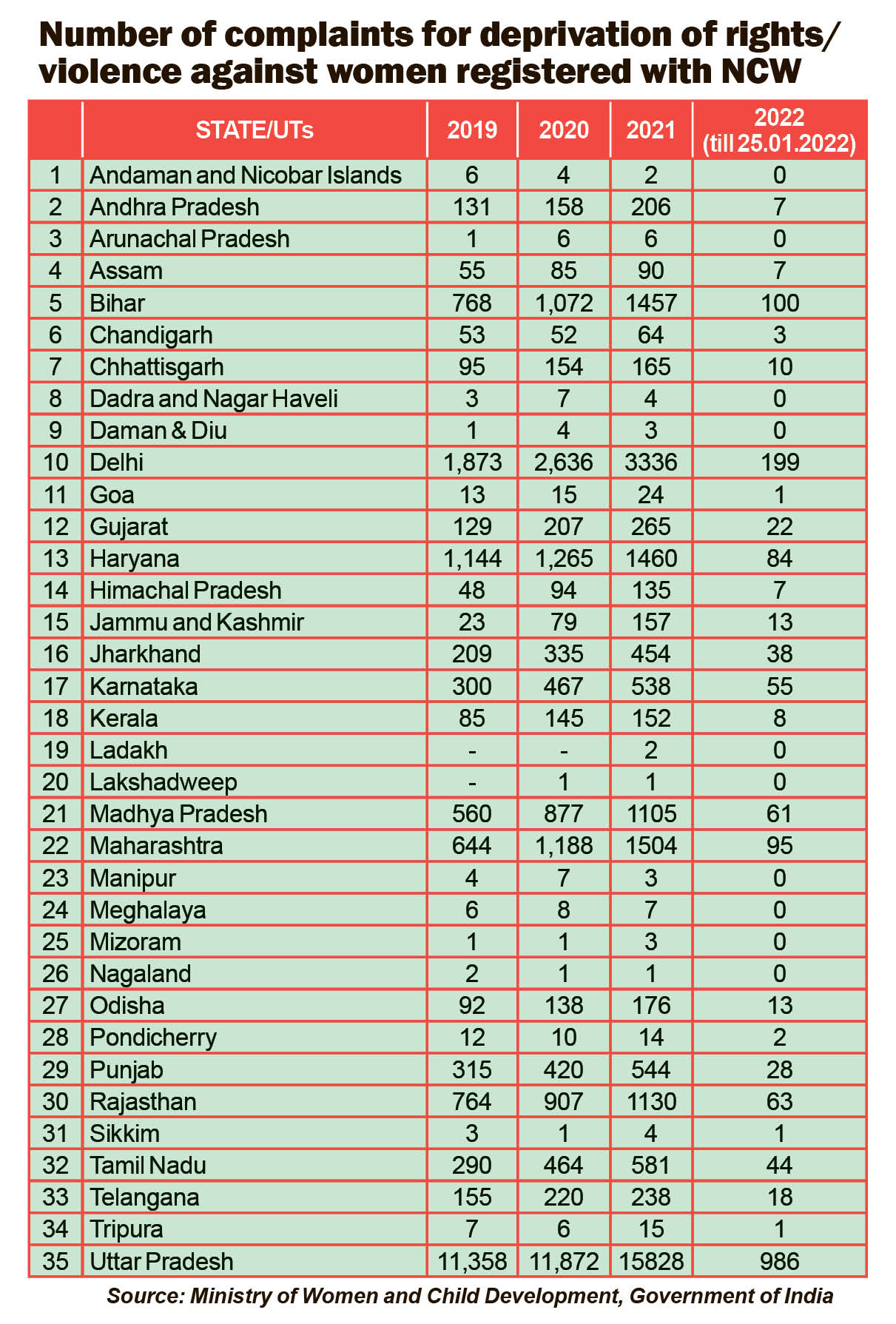 States/UTs with above 1,000 complaints in 2021 were Bihar (1,457), Haryana (1,460), Madhya Pradesh (1,105), and Rajasthan (1,130).
