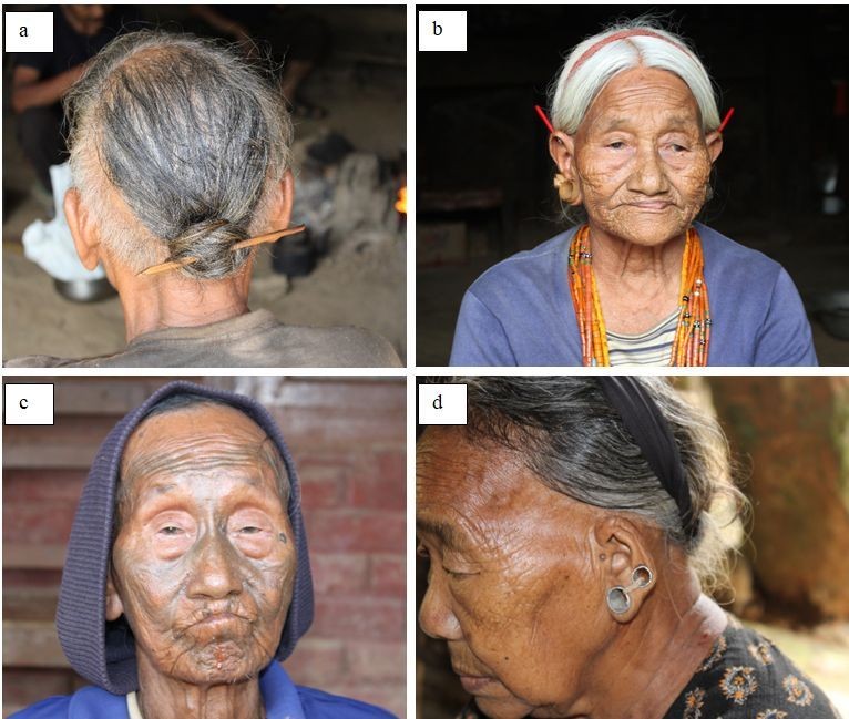 Fig. 1: a. Elder man adorned in past Konyak traditional hairstyle; b. Elder woman from the Ahng (royal) clan; c. The last tattooed man; d. Na-gha (ear-piercing) practice of Konyak. Source: Fieldwork in Chi Village, Mon district, Nagaland, India; 2019. Photographer: Amo Konyak B