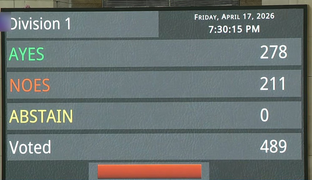 New Delhi: The Constitution (131st Amendment) Amendment Bill fails to pass in the Lok Sabha despite securing 278 ayes and 211 noes, with 489 members voting, as it did not achieve the required two-thirds majority during voting in the House, in New Delhi on Friday, April 17, 2026. (IANS/Sansad TV)